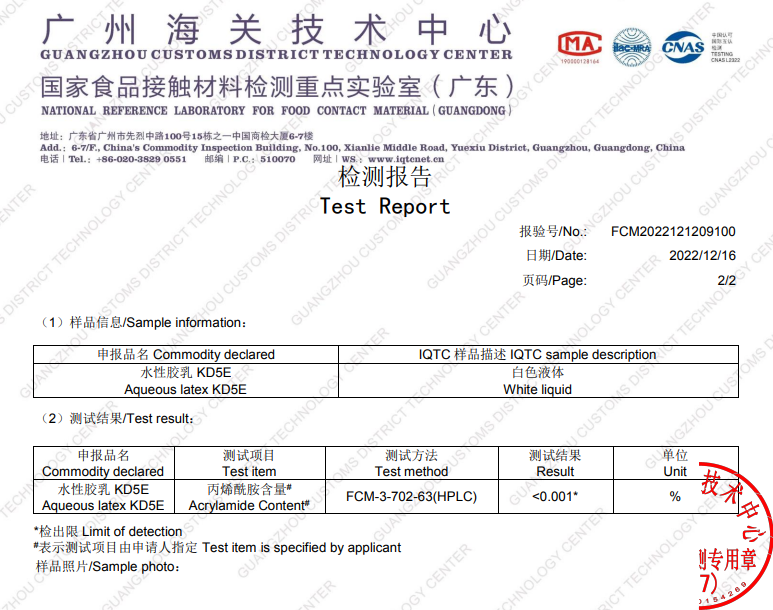 該膠水主要應(yīng)用于特種食品紙無氟防水、防油的涂膠。涂膠后的紙柔軟度、防水性、防油性、拉伸強(qiáng)度等指標(biāo)都達(dá)到特定的要求。該膠水按照ISO22000 標(biāo)準(zhǔn)要求生產(chǎn),符合美國 FDA 標(biāo)準(zhǔn)和歐盟 BRCGS 認(rèn)證。